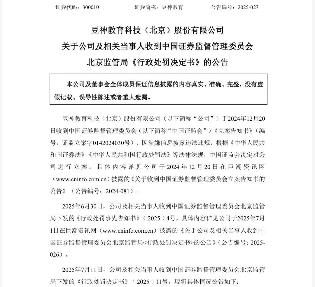 豆神教育科技()股份无限公司(下称“豆神教育”)发布通知布告,2020—2023年,豆神教育从停业务遭到冲击,形成《证券法》第一百九十七条第一款所述违法行为;豆神教育及其控股子公司涉及未按披露诉讼、仲裁事项5件,2023年,